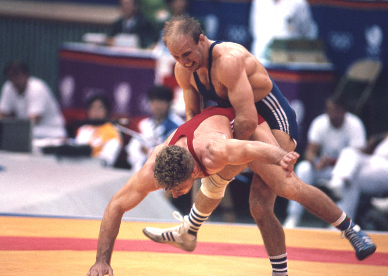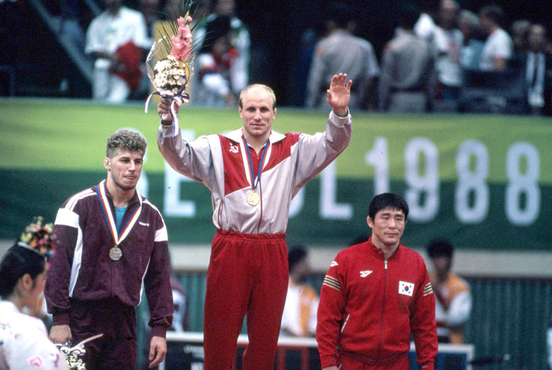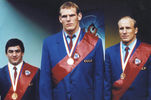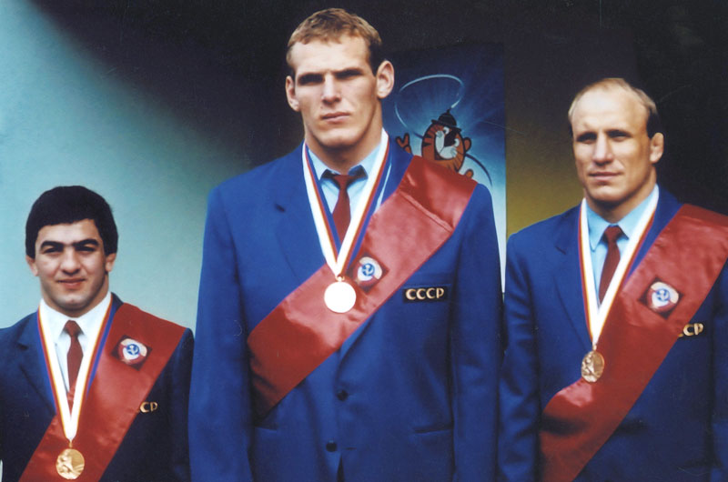 Советские борцы греко-римского стиля – триумфаторы Сеула. Слева направо: Левон Джулфалакян (весовая категория до 68 кг), Александр Карелин (130 кг), Михаил Мамиашвили (до 82 кг) Фото предоставлено ФСБР