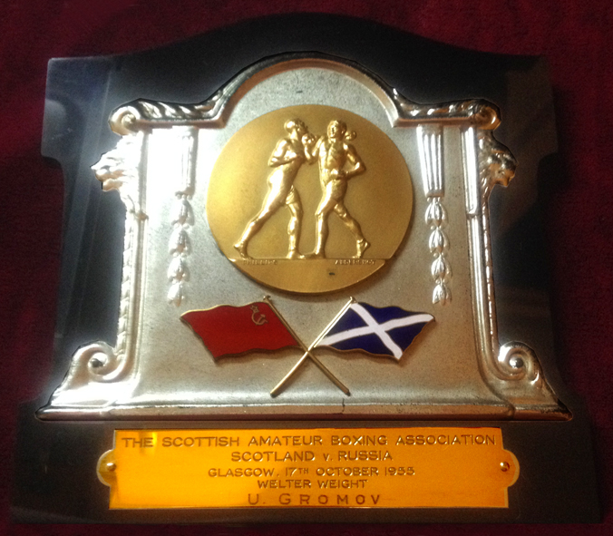 Приз, вручённый Юрию Громову за победу в матчевой встрече между шотландскими и советскими боксёрами в 1955 году. Глазго, 17 октября 1955 года