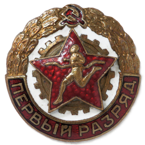Знак Сергея Беляева «Первый разряд» по футболу. Знак изготовлен на Эмальерной фабрике М.Т.Х. (1954)