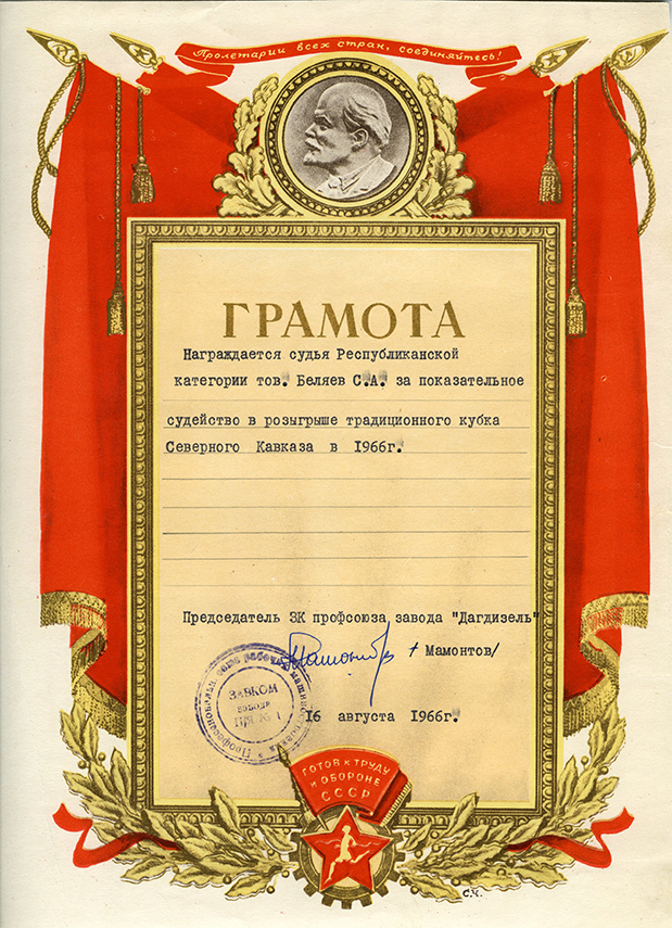 Грамоты от Профсоюзной организации завода «Дагдизель» и Совета Союза спортивных обществ и организаций города Каспийска. (16.08.1966)