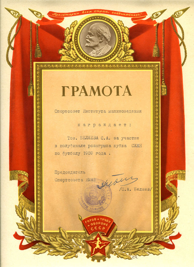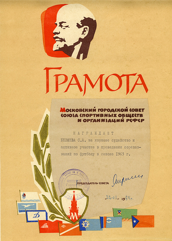 Благодарность С.А. Беляеву от Всероссийской федерации футбола. (1968)