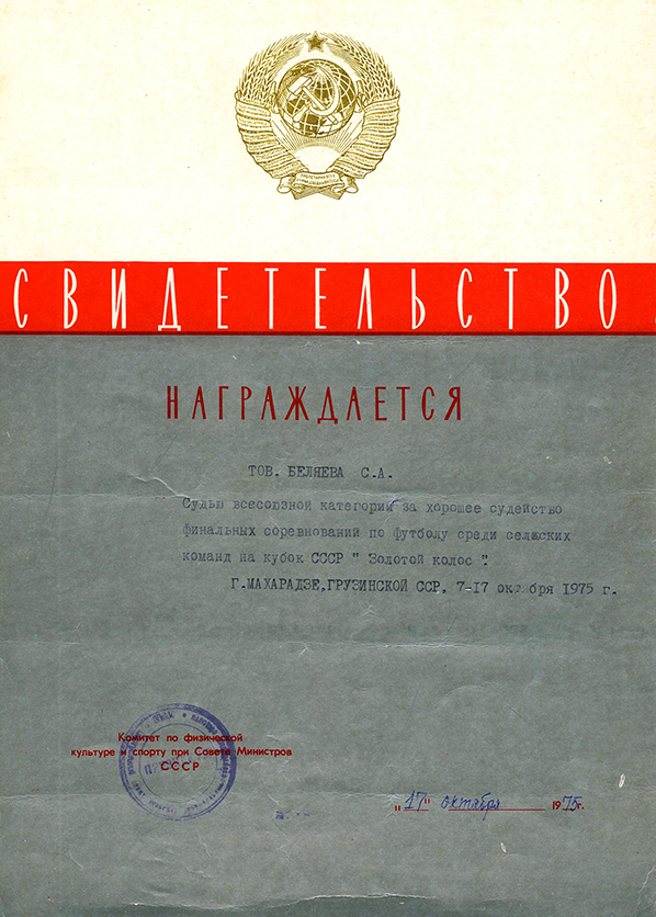 Удостоверение о присвоении С.А. Беляеву звания «Судьи Всесоюзной категории» по футболу. (1972)