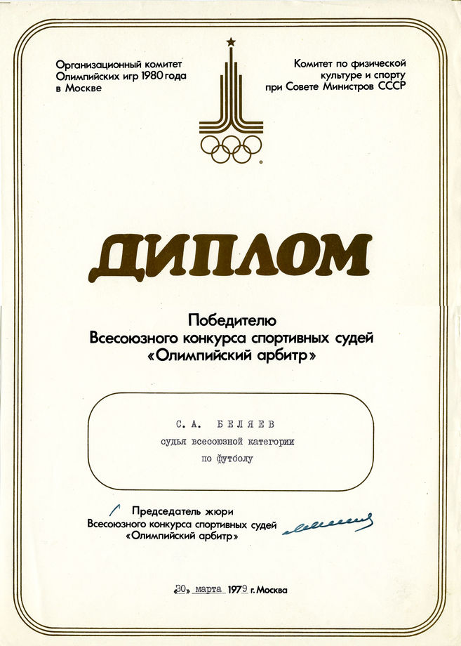 Знак и диплом победителя Всесоюзного конкурса спортивных судей «Олимпийский арбитр» судьи Всесоюзной категории по футболу С.А. Беляева. (1979)