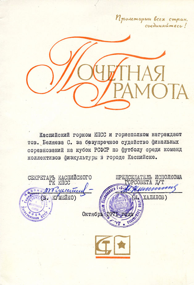 Почётная грамота от Горкома КПСС и Горисполкома города Каспийска. (10.1971)