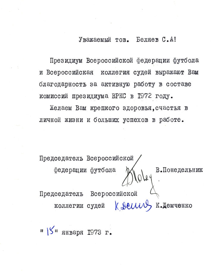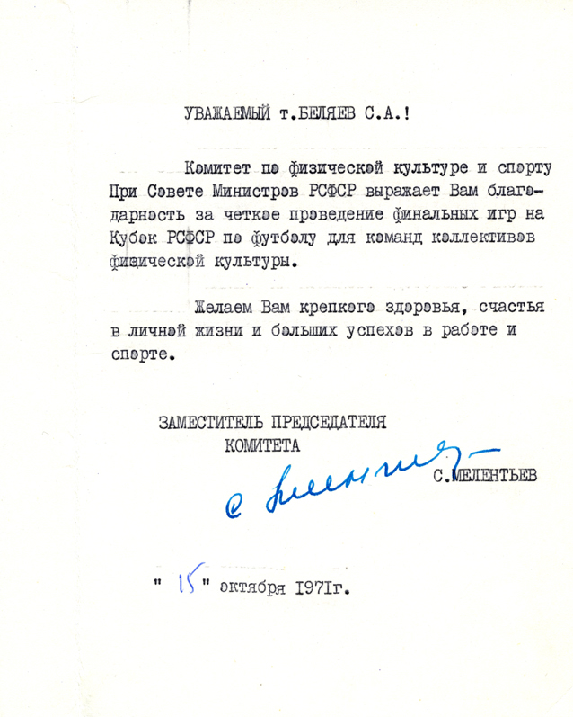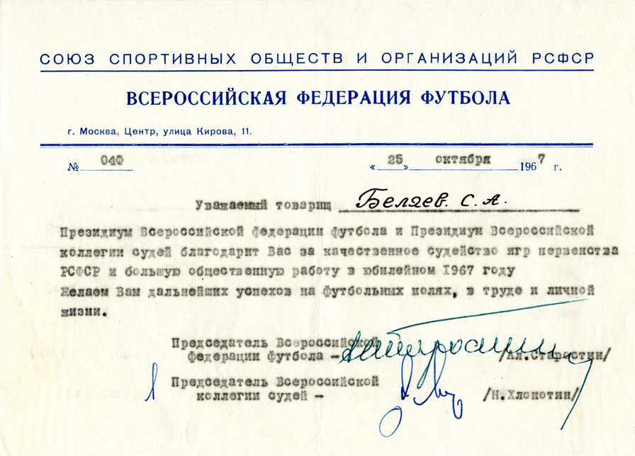 Благодарность С.А. Беляеву от Всероссийской федерации футбола. (25.10.1967)