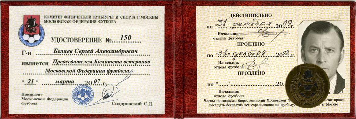 Удостоверение о том, что С.А. Беляев является Председателем Комитета ветеранов Московской федерации футбола. (21.03.2007)