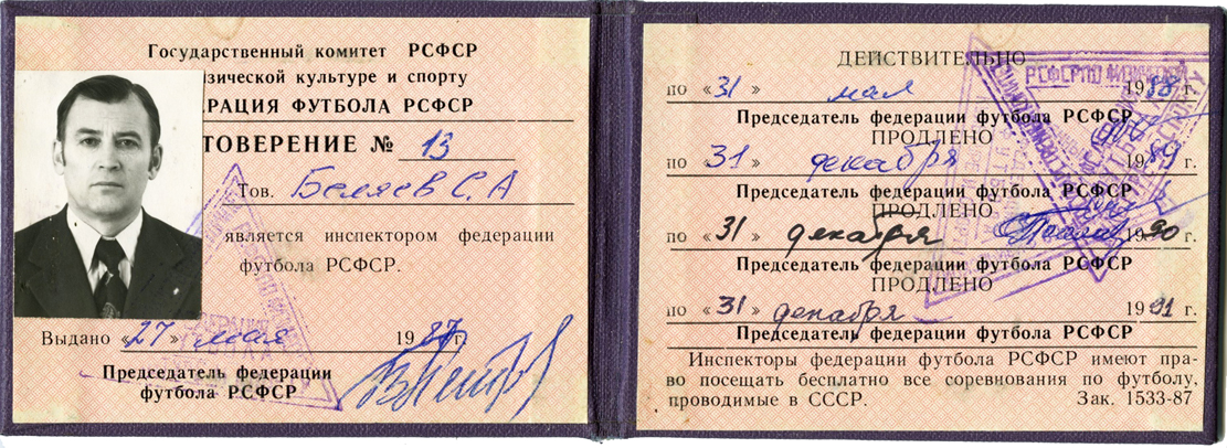 Удостоверение о том, что С.А. Беляев является инспектором Федерации футбола РСФСР. (27.05.1987)