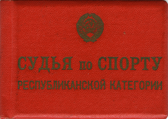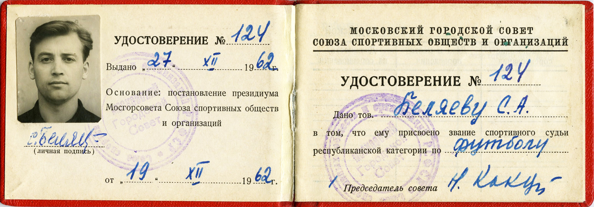 Удостоверение о присвоении С.А. Беляеву звания «Спортивного судьи Республиканской категории» по футболу. (19.12.1962)