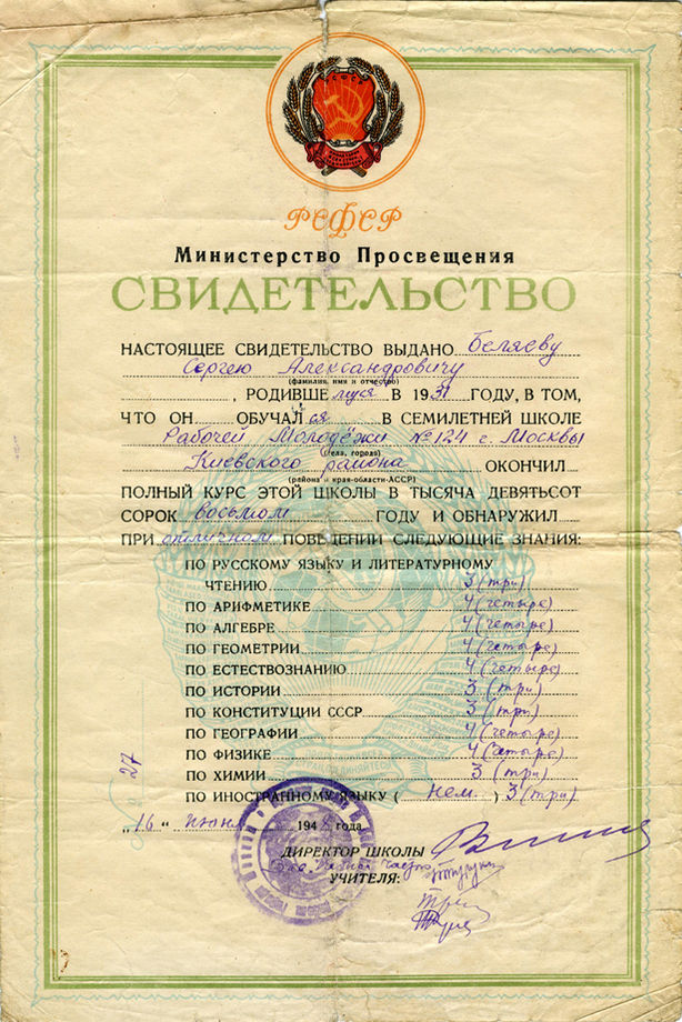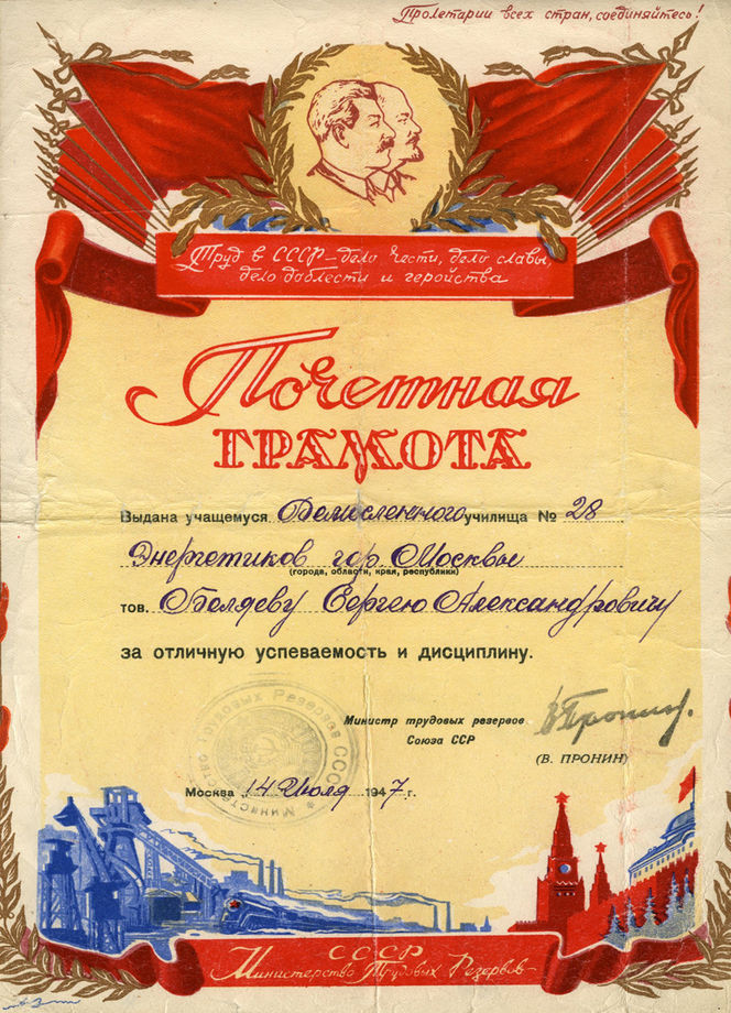 Награды, документы  Почётная грамота Сергею Беляеву за отличную учёбу и дисциплину по случаю окончания Ремесленного училища энергетиков № 28 города Москвы. (14.07.1947)