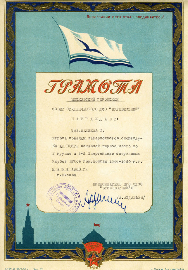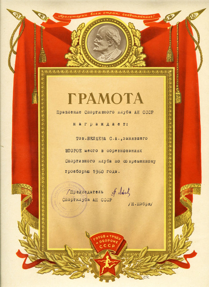 Грамота от Комитета по физической культуре и спорту Москвы в связи с 50-летием С.А. Беляева. (1981)