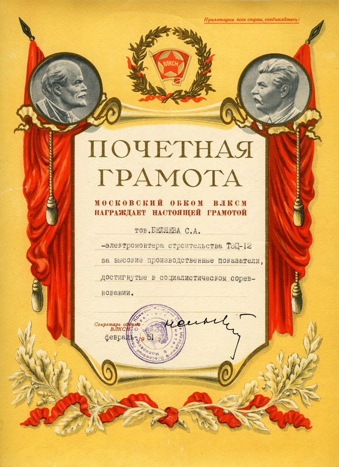 Почётная грамота от Московского обкома ВЛКСМ С.А. Беляеву (02.1951)