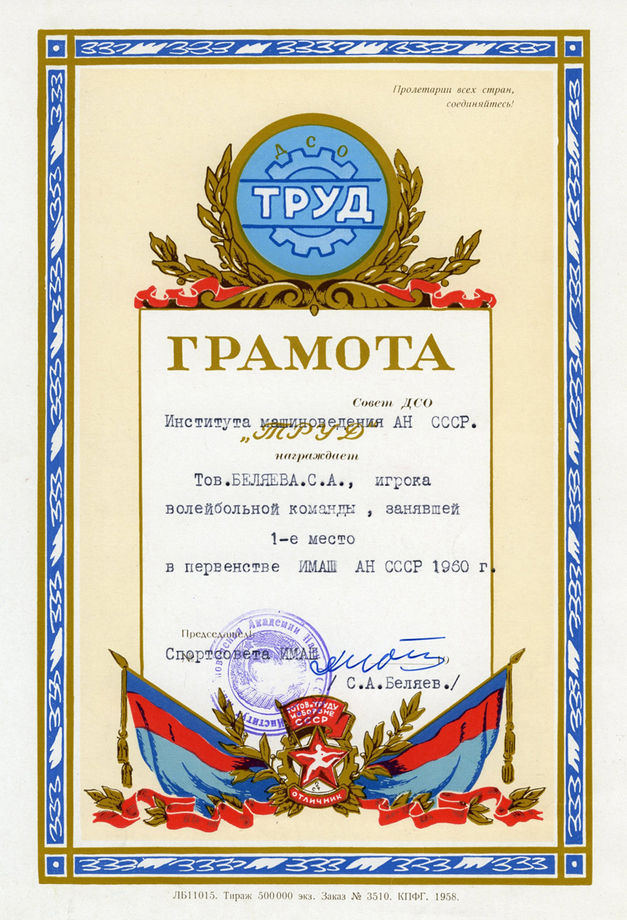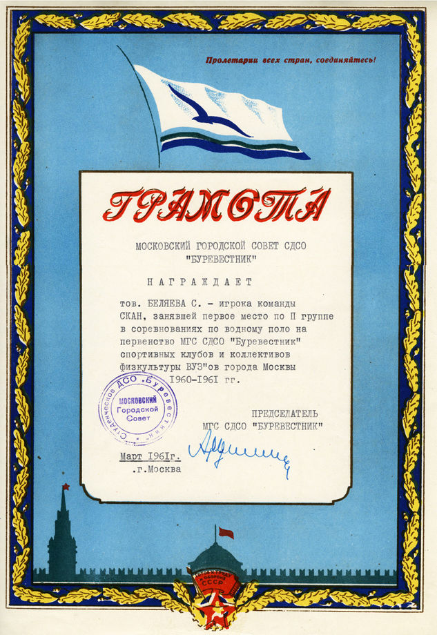 Диплом первой степени от Всероссийского совета Союза спортивных обществ и организаций. (28.10.1962)