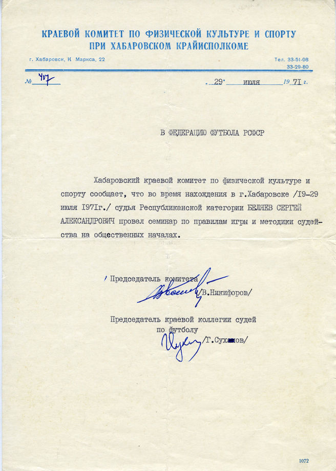 Письмо в Федерацию футбола РСФСР от Хабаровского краевого комитета по физической культуре и спорту. (29.07.1971)
