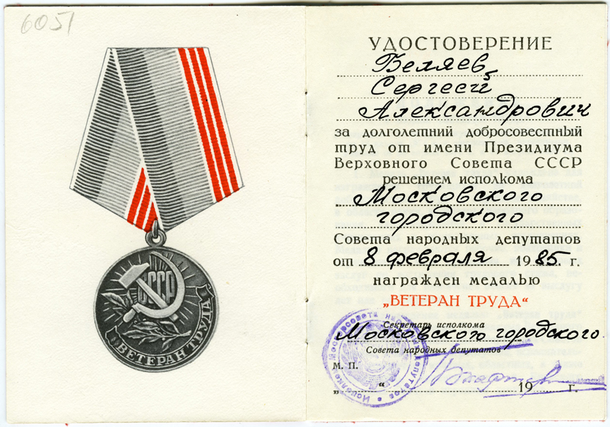 Почётная грамота от Центрального совета Всесоюзного профсоюзного добровольного спортивного общества «Труд». (20 – 26.07.1984)  Медаль «Ветеран труда» вручена С.А. Беляеву в 1985 году
