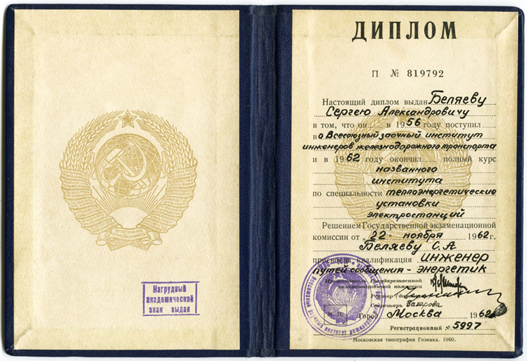 Диплом Сергея Беляева об окончании Всесоюзного заочного института инженеров железнодорожного транспорта, присвоена квалификация инженера путей сообщения-энергетика. (22.11.1962)