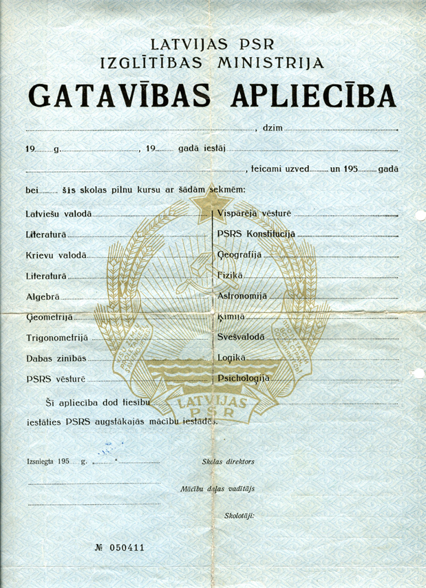 Аттестат зрелости Сергея Беляева об окончании школы рабочей молодёжи города Вентспилса Латвийской ССР. (20.06.1955)