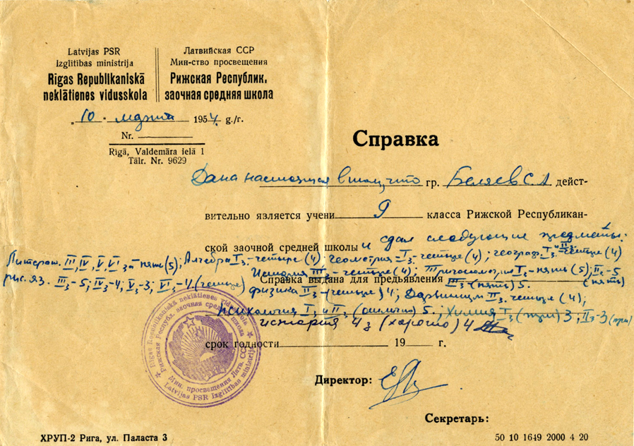 Справка об окончании Сергеем Беляевым 9 класса Рижской республиканской заочной средней школы. (10.03.1954)