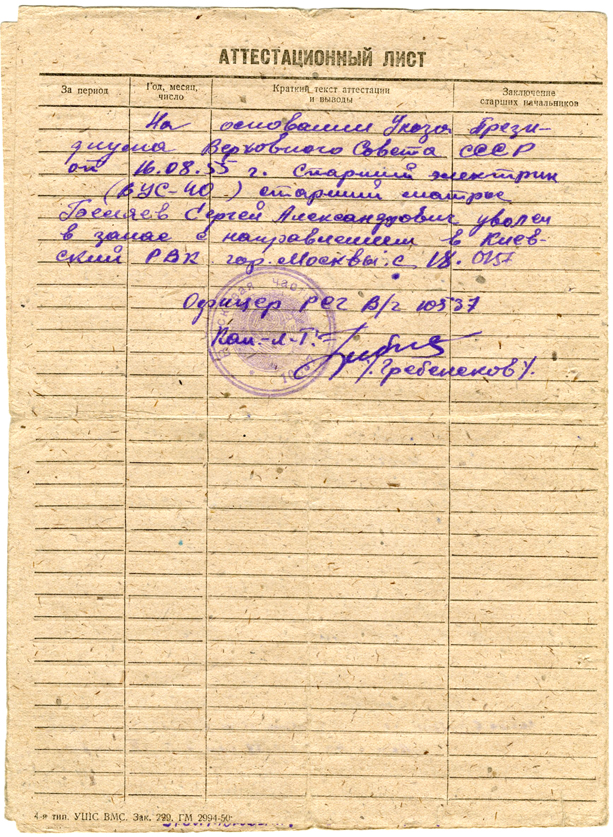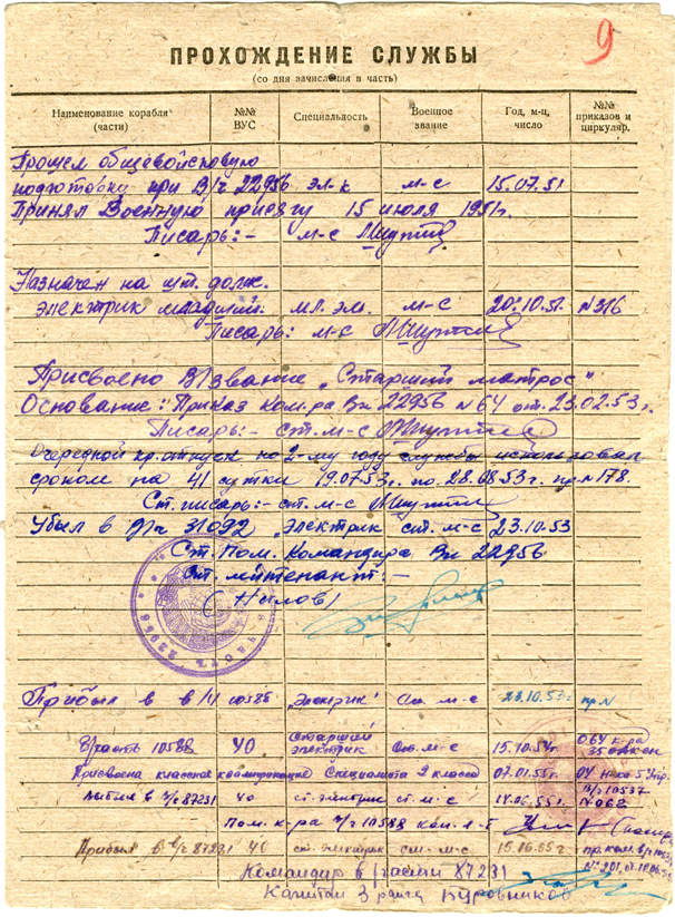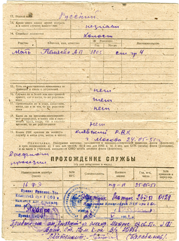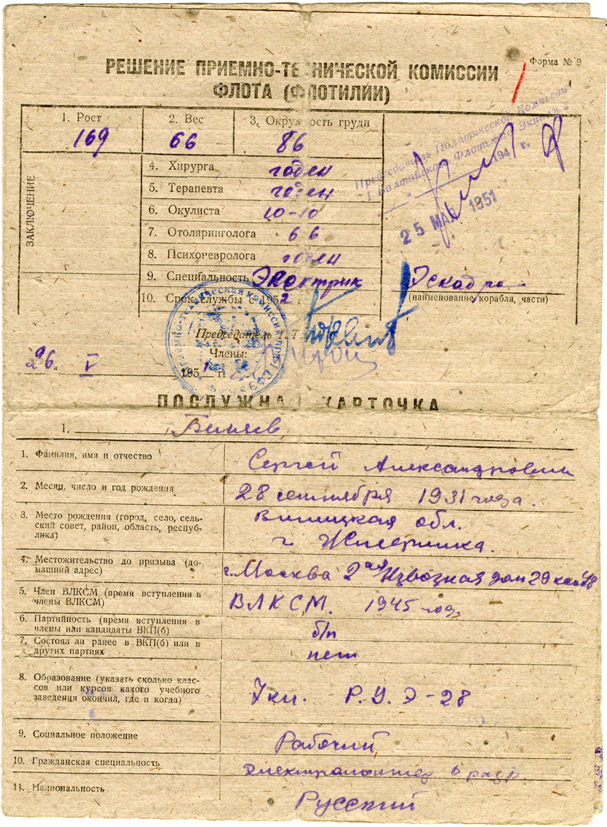 Послужная карточка С.А. Беляева. Решение приёмно-технической комиссии флота. (26.05.1951)