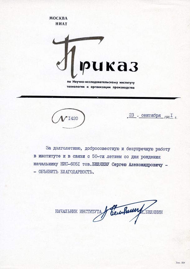 Поздравления от Научно-исследовательского института технологии и организации производства (НИАТ) в связи с 50-летием Сергея Александровича Беляева. (28.09.1981)