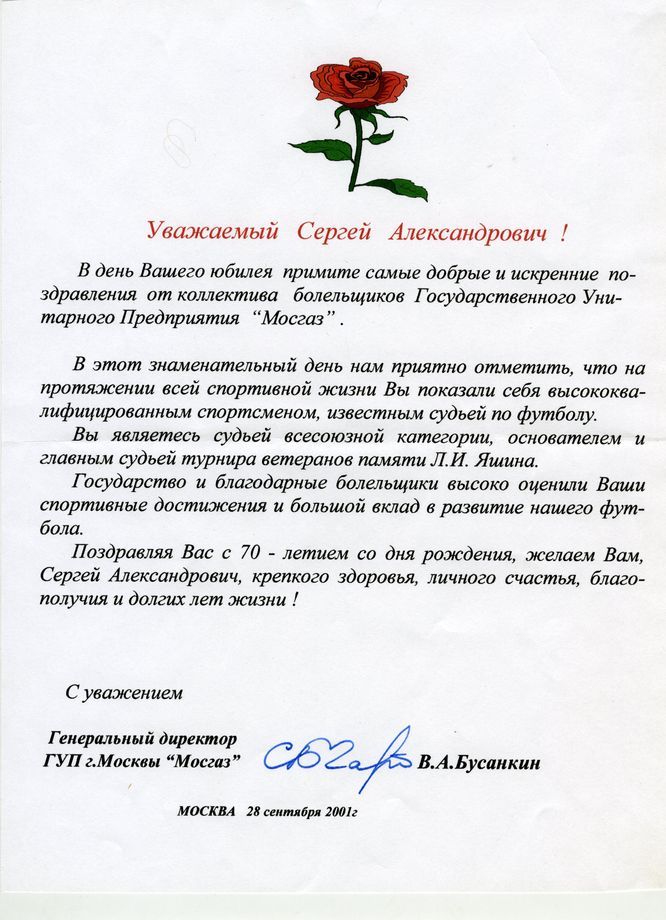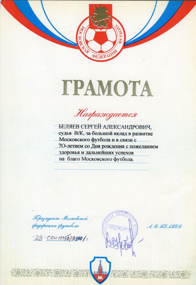 Грамота от Московской федерации футбола (28.09.2001)  Поздравительное письмо от болельщиков ГУП «Мосгаз». (28.09.2001) Знак «Почётный судья» С.А. Беляева