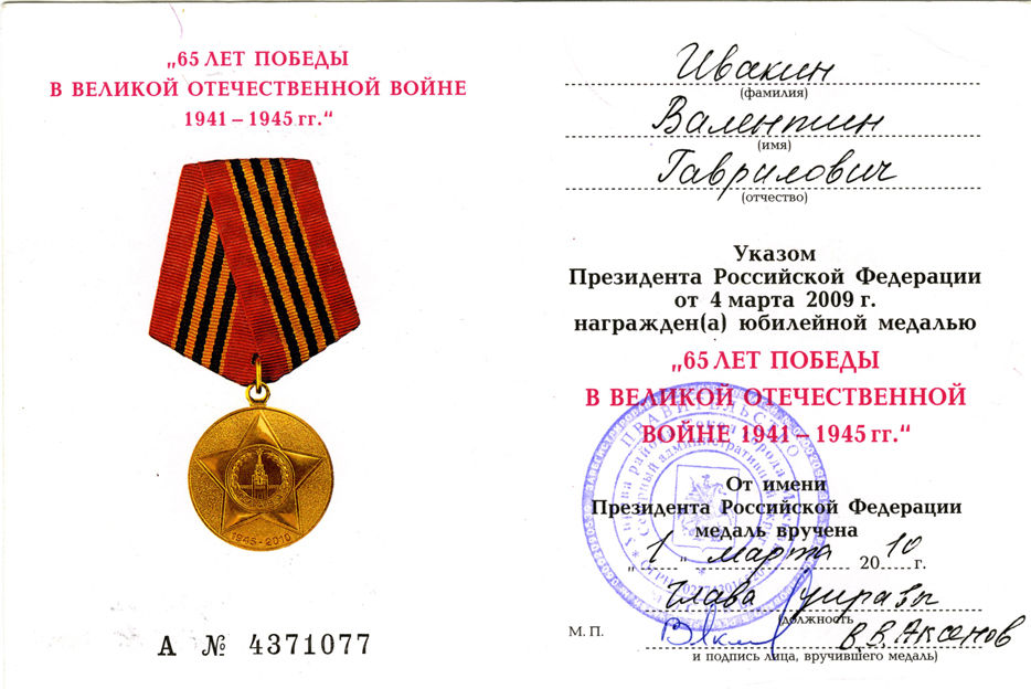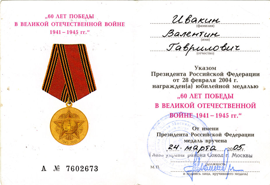 Именная медаль Ивакина В.Г. за победу