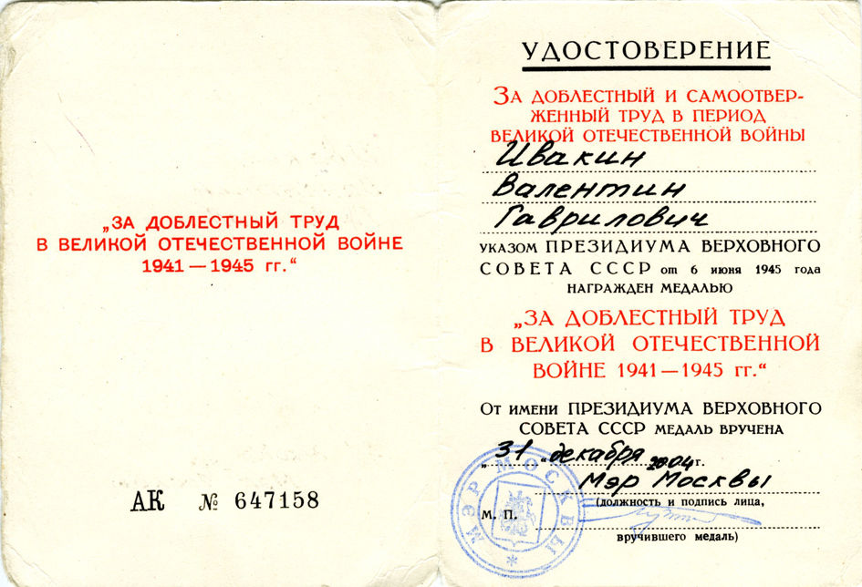 «За доблестный труд в Великой Отечественной войне 1941 – 1945 гг.»