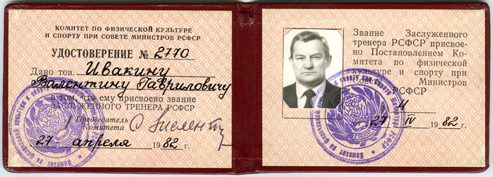 Удостоверение заслуженного тренера РСФСР