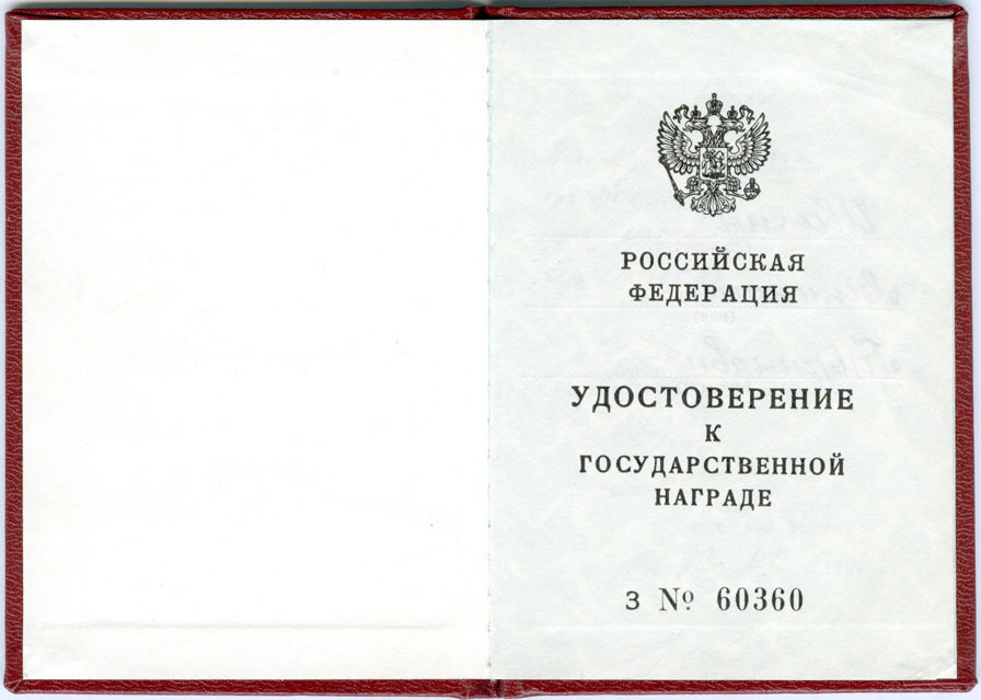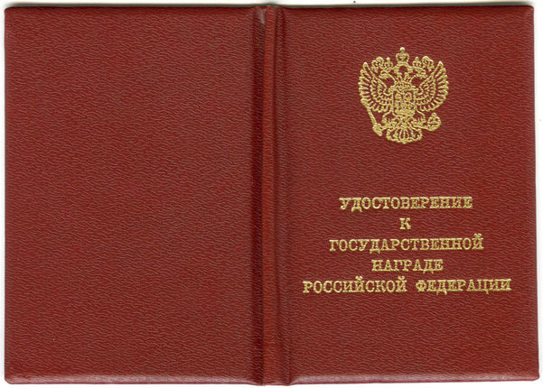 Удостоверение к государственной награде Российской Федерации