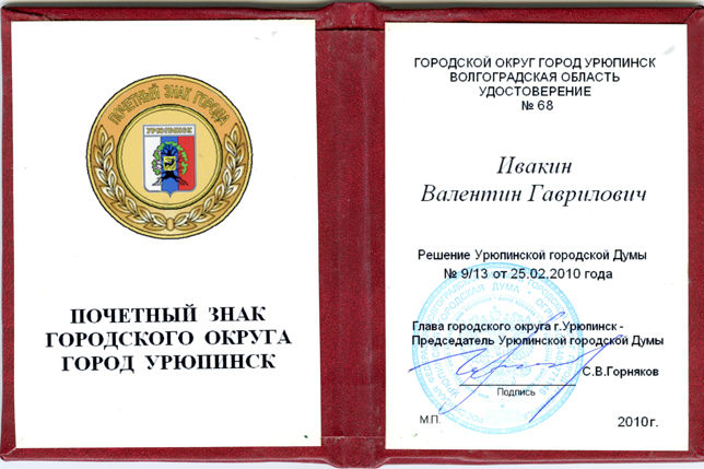 и Почётный знак городского округа города Урюпинска.