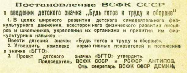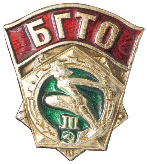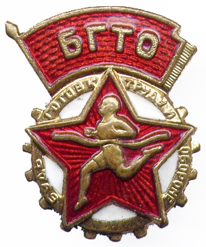 В 1934 году в комплексе ГТО появилась ступень для детей «Будь готов к труду и обороне СССР» (БГТО) с двумя возрастными группами: 13–14 и 15–16 лет. Комплекс состоял из 16 спортивных испытаний. Кроме того, обладатель знака БГТО должен был уметь провести занятия по одному из видов спорта, знать правила и уметь судить спортивные игры.