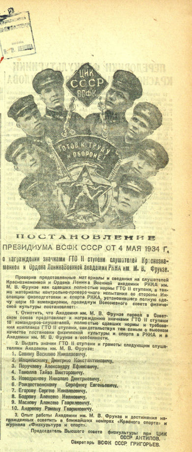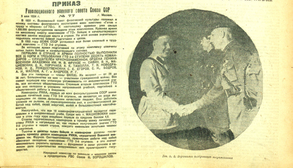 В мае 1934 года газета «Красный Спорт» сообщила, что знаки ГТО II ступени под номерами 1 – 10 вручены десяти командирам Рабоче-крестьянской Красной Армии слушателям Военной академии имени М.В. Фрунзе: B.Н. Савину, А.Г. Поручаеву, Т.В. Томмола, C. Е. Рождественскому, С. И. Егорову и другим. Каждый из них получил от наркома обороны именные золотые часы с надписью «Лучшему физкультурнику Советского Союза от Ворошилова К. Е.».