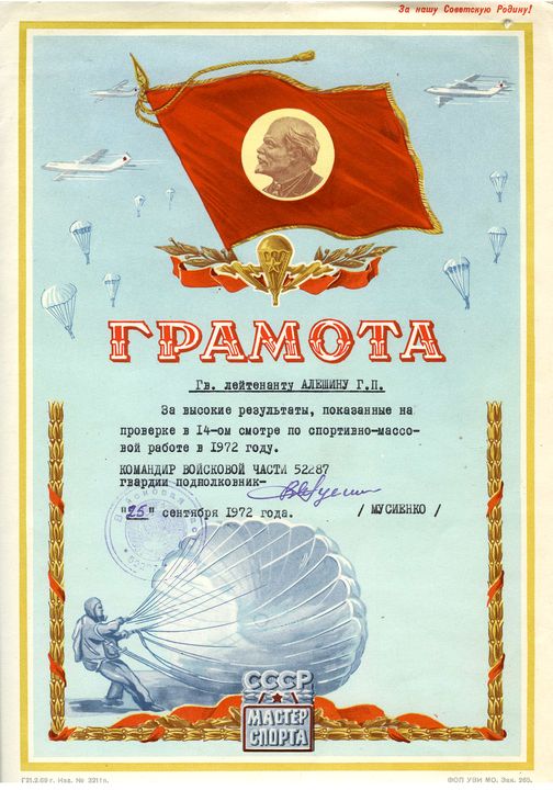 Документы, награды  Грамота от командира войсковой части 52287 гвардии лейтенанту Алёшину Г.П. «За высокие результаты, показанные на проверке в 14-ом смотре по спортивно-массовой работе в 1972 году. 25 сентября 1972 года»