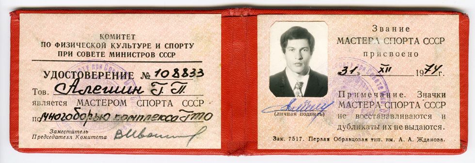 Удостоверение № 108833 «МАСТЕР СПОРТА СССР» Комитета по физической культуре и спорту при Совете Министров СССР «Тов. Алёшин Г.П. является МАСТЕРОМ СПОРТА СССР по многоборью комплекса ГТО. Звание присвоено 31.XII.1974 года»