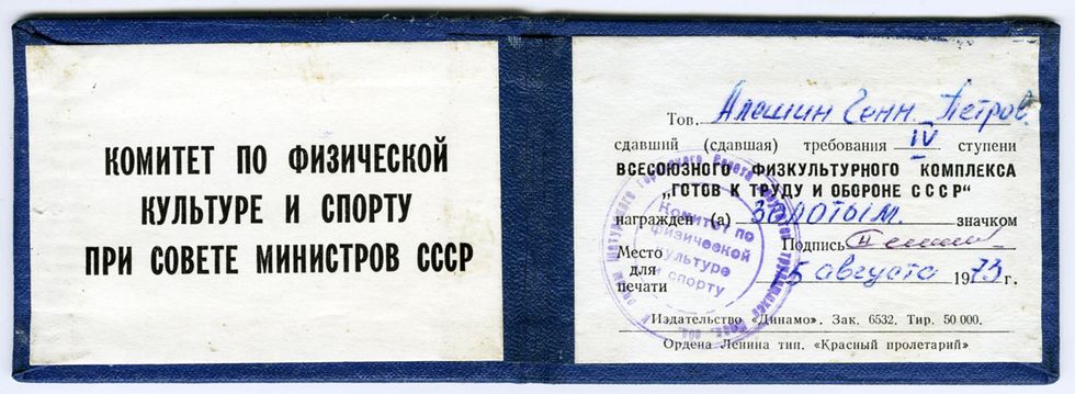 Удостоверение Комитета по физической культуре и спорту при Совете Министров СССР. «Тов. Алёшин Геннадий Петрович, сдавший требования IV ступени Всесоюзного физкультурного комплекса «Готов к труду и обороне СССР», награждён ЗОЛОТЫМ значком. 15 августа 1973 года»
