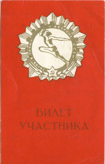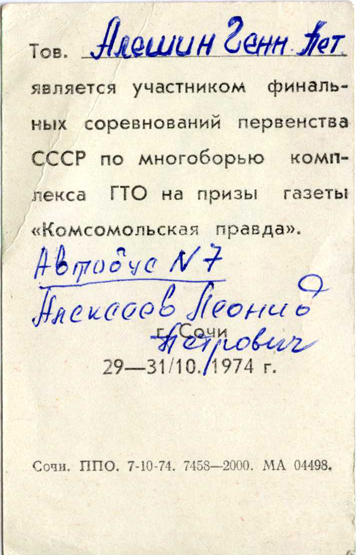 Номер и билет участника финальных соревнований первенства СССР по многоборью комплекса ГТО на призы газеты «Комсомольская правда» Алёшина Геннадия Петровича, г. Сочи, 29 – 30.10.1974 года