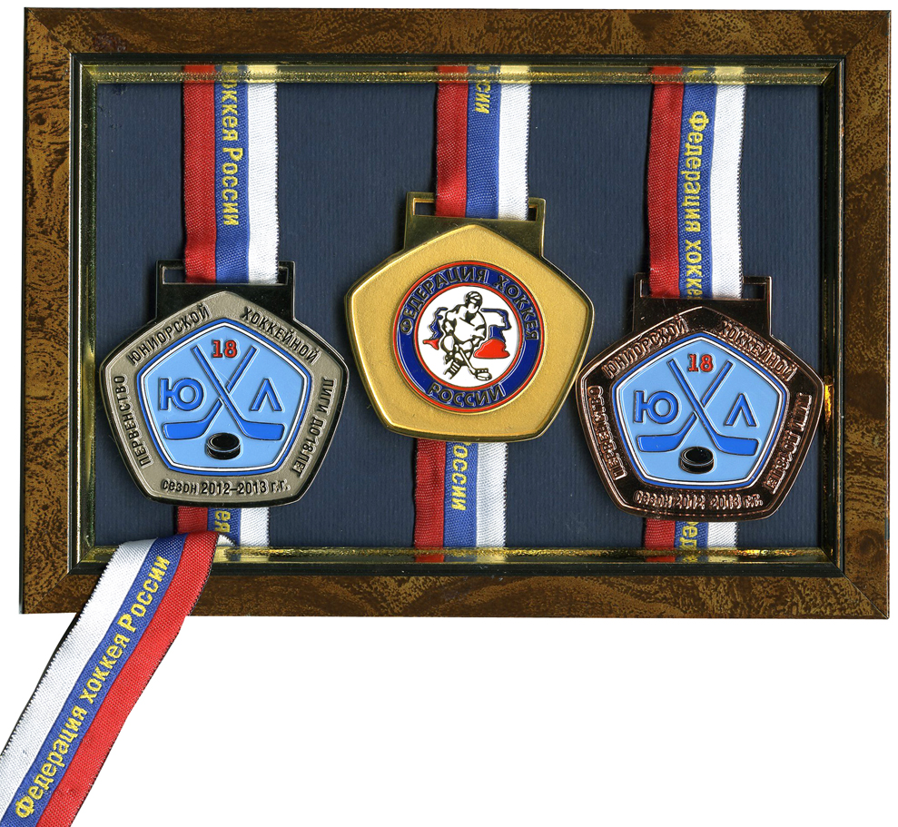 Наградные медали первенства Юниорской хоккейной лиги до 18 лет. Сезон 2012 – 2013 годов. Федерация хоккея России. Производство Объединения «Диалог-Конверсия»
