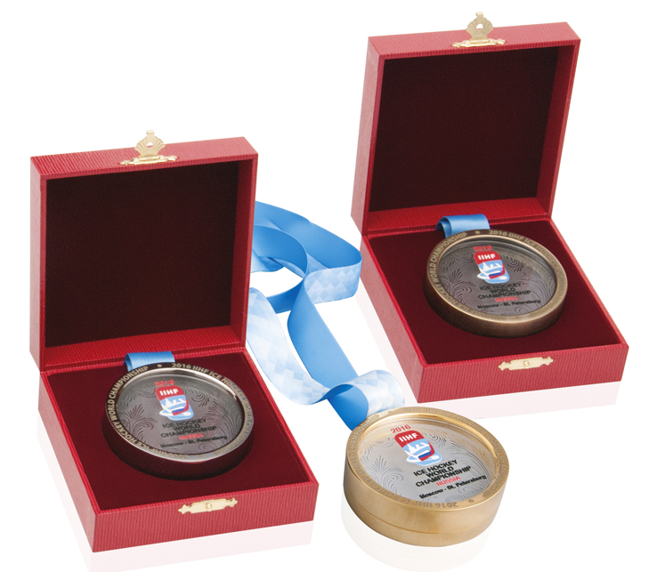 Наградные медали чемпионата мира по хоккею 2016 года в Москве. Производство Объединения «Диалог-Конверсия»