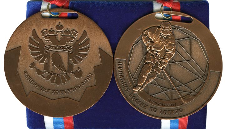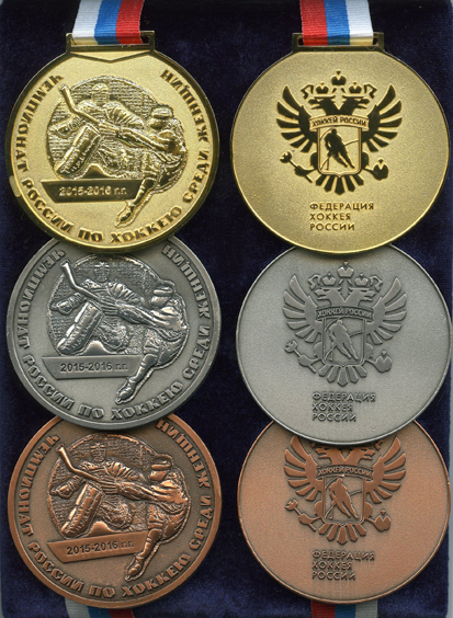 Наградные медали чемпионата России по хоккею сезона 2015 – 2016. Федерация хоккея России. Производство Объединения «Диалог-Конверсия»  Наградные медали чемпионата России по хоккею среди женщин сезона 2015 – 2016. Федерация хоккея России. Производство Объединения «Диалог-Конверсия»