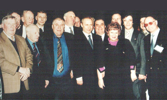 Торжества по поводу 30-летия хоккейной Суперсерии 1972 года между сборной СССР и командой канадских профессионалов. Президент Российской Федерации Владимир Путин и гости церемонии: Борис Михайлов, Евгений Зимин, Юрий Королев, Олег Белаковский, Александр Гусев, Евгений Мишаков, Александр Рагулин, Елена Боброва, Юрий Блинов, Владимир Писаревский, Вячеслав Старшинов. Лужники, Ледовый дворец. 2002 год