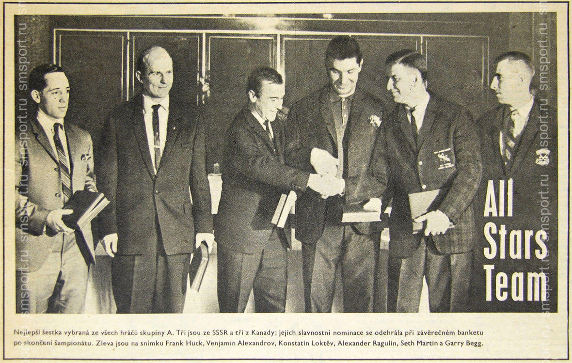 На чемпионате мира 1966 года в символическую сборную мира вошли Александр Рагулин, Константин Локтев и Вениамин Александров. Компанию им составили канадские игроки, слева направо: Фрэнсис Хакк, Сет Мартин и Гэри Бегг