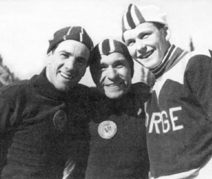 Евгений Гришин – чемпион VII Олимпийских зимних игр 1956 года в Кортине д'Ампеццо на дистанции 500 м (с новым олимпийским рекордом). Слева – серебряный призёр Рафаил Грач (СССР), справа – бронзовый призёр Альф Естванг (Норвегия)