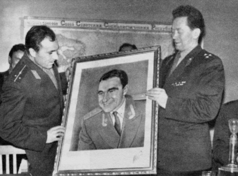 Начальник Центрального спортивного клуба Армии Полковник Новгородов за победы на Играх в Скво-Вэлли вручает старшему лейтенанту Евгению Гришину его портрет