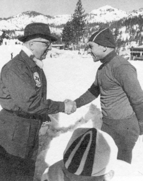 Президент Международной федерации конькобежного спорта С. Лофтман поздравляет Евгения Гришина с победой. VIII Олимпийские зимние игры 1960 года в Скво-Вэлли