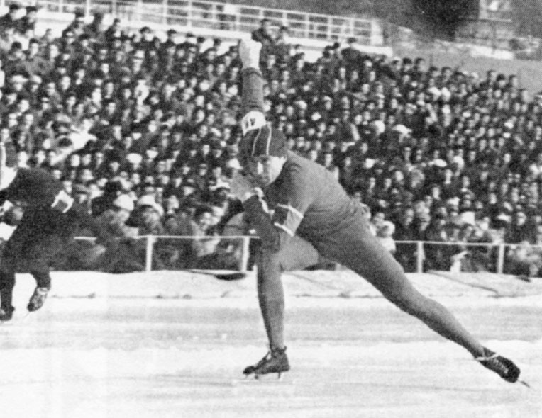 На первенстве мира 1960 года. Евгений Гришин – чемпион мира на дистанции 500 метров, серебряный призёр на 1500-метровке. Давос (Швейцария)