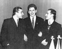 На дистанции 1500 метров лучшими были Евгений Гришин и Юрий Михайлов (в центре) с одинаковым временем и новым мировым рекордом. Бронзовая медаль у финского скорохода Тойво Салонена (слева). VII Олимпийские зимние игры 1956 года в Кортине д'Ампеццо