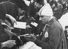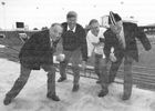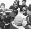 С норвежскими болельщиками на стадионе «Бишлет» (Осло). Чемпионат мира 1956 года. Справа: за штурвалом полярного судна «Фрам» знаменитого норвежского исследователя Фритьофа Нансена
