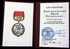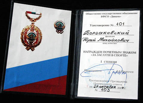 Удостоверение и почетный знак Общественно-государственного объединения ВФСО «Динамо» «За заслуги в спорте», врученный Юрию Борзаковскому в 2004 году