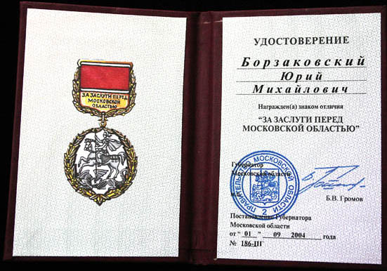 Удостоверение и знак отличия «За заслуги перед Московской областью», 2004 год