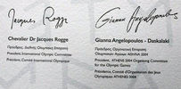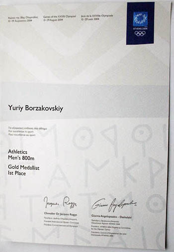 Свидетельство Международного олимпийского комитета и Оргкомитета Игр 2004 года в Афинах о завоевании Юрием Борзаковским звания олимпийского чемпиона на дистанции 800 метров