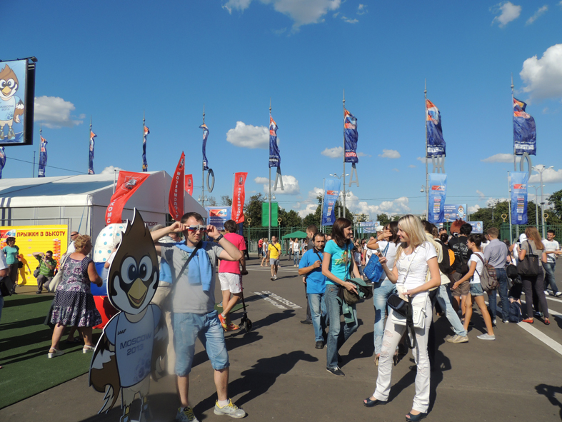 У входа в Лужники зрителей встречал талисман соревнований – весёлый воробей Румпо, можно было сфотографироваться рядом с мировой звездой, почувствовать вес настоящего спортивного снаряда...